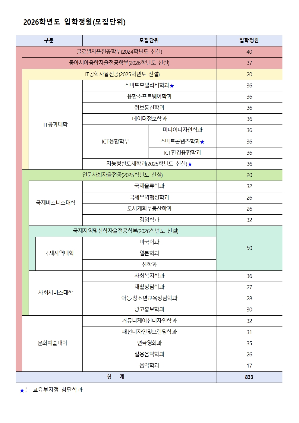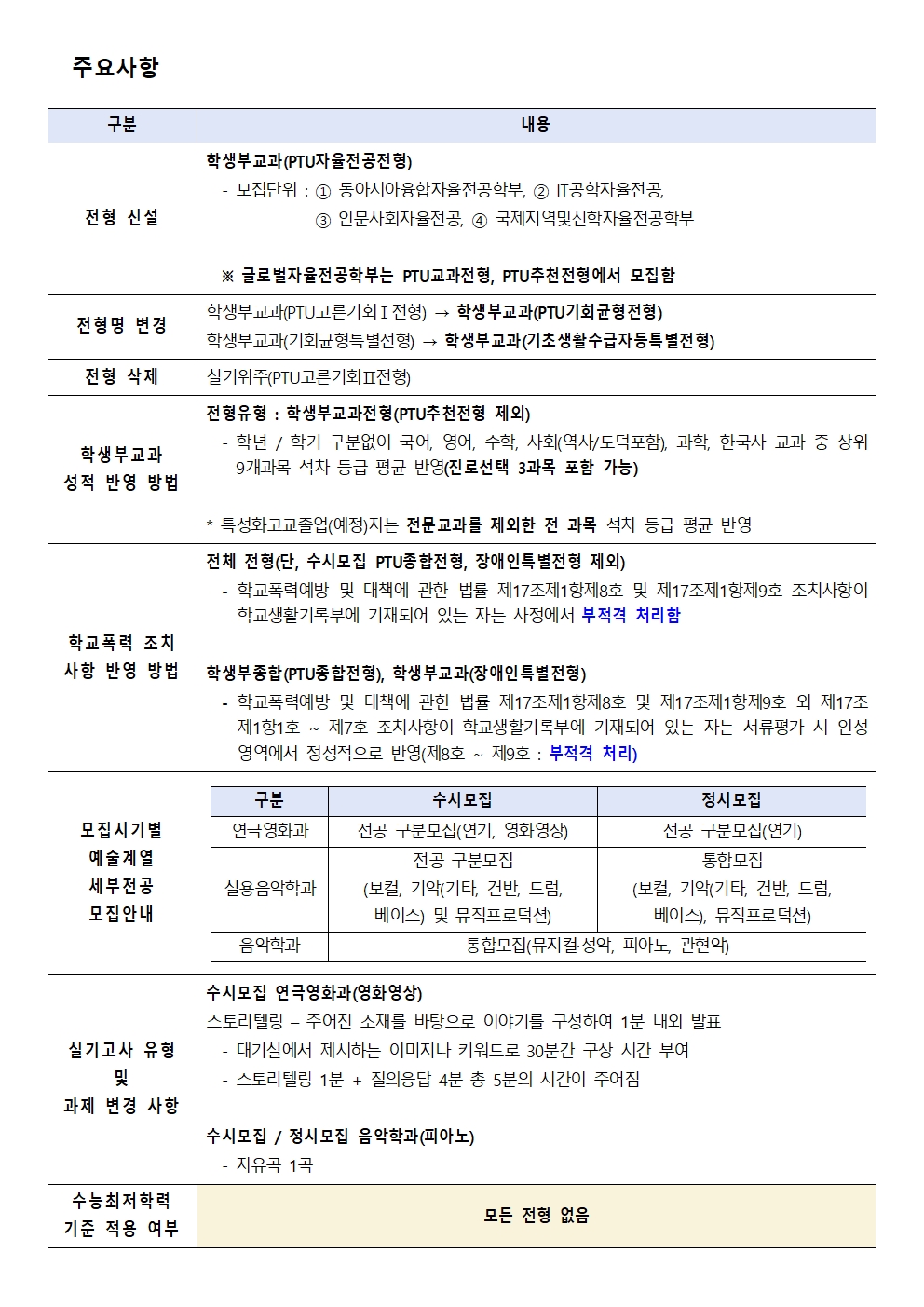 fnctId=bbs,fnctNo=255 글번호 31982 2026학년도 수시모집 모집요강 안내 수정일 2025.05.30 작성자 윤이슬 조회수 41337 등록일 2025.05.30 2026학년도 수시모집 모집요강 안내 2026학년도 수시모집 모집요강을 다음과 같이 안내합니다. <첨부파일 또는 위 이미지 클릭> 첨부파일 평택대학교 2026학년도 수시모집 모집요강(최종)(수정)[배포용].hwp 평택대학교 2026학년도 수시모집 모집요강(최종)(수정)[배포용].pdf 이전글 2027학년도 대학입학전형시행계획(2025년 3월 기준) 윤이슬 2025-04-30 15:00:00.0 다음글 2026학년도 대학입학전형시행계획 변경 안내(최종)(2025년 5월 기준) 윤이슬 2025-06-04 17:00:00.0