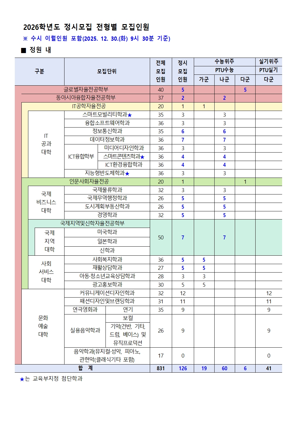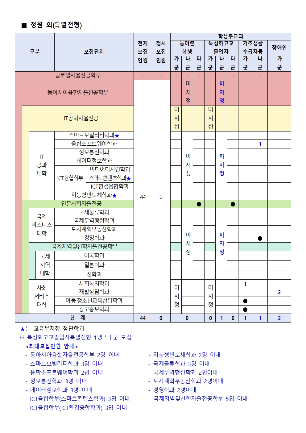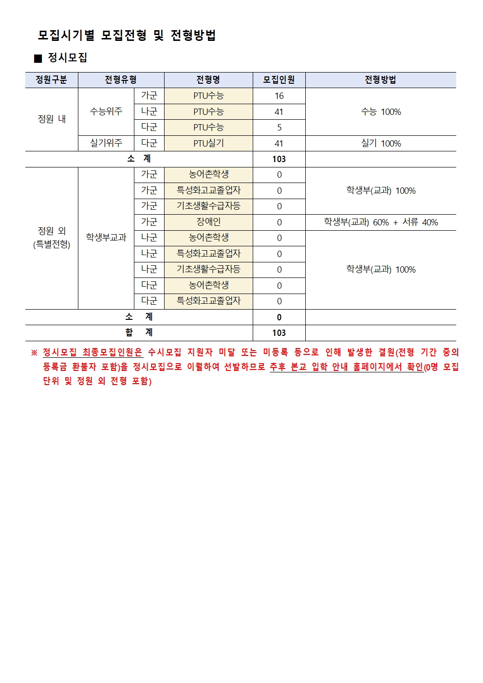 정시모집으로 이월하여 선발하므로 추후 본교 입학 안내 홈페이지에서 확인(0명 모집 단위 및 정원 외 전형 포함)